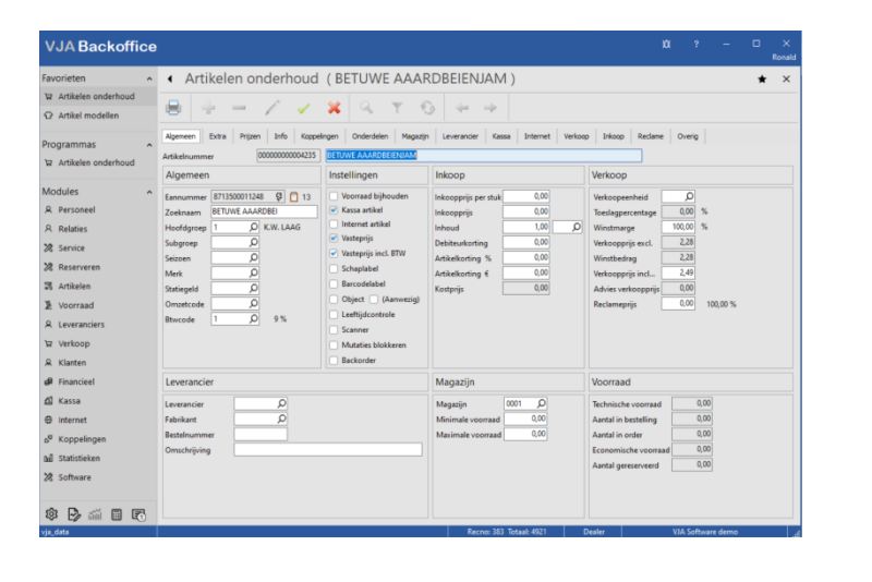 De basis van ieder winkel automatiseringssysteem vormen de artikelgegevens. Met VJA Backoffice kunt u op eenvoudige wijze u artikelen onderhouden en actualiseren. De artikel gegevens zijn overal binnen het pakket waar met artikelen wordt gewerkt direct oproepbaar.De complete status van een artikel wordt binnen de artikel kaart bijgehouden, zo kunt u precies zien wanneer het artikel verkocht is, wat de huidige voorraad van een artikel is en welke leveranciers het artikel in hun assortiment beschikbaar hebben.